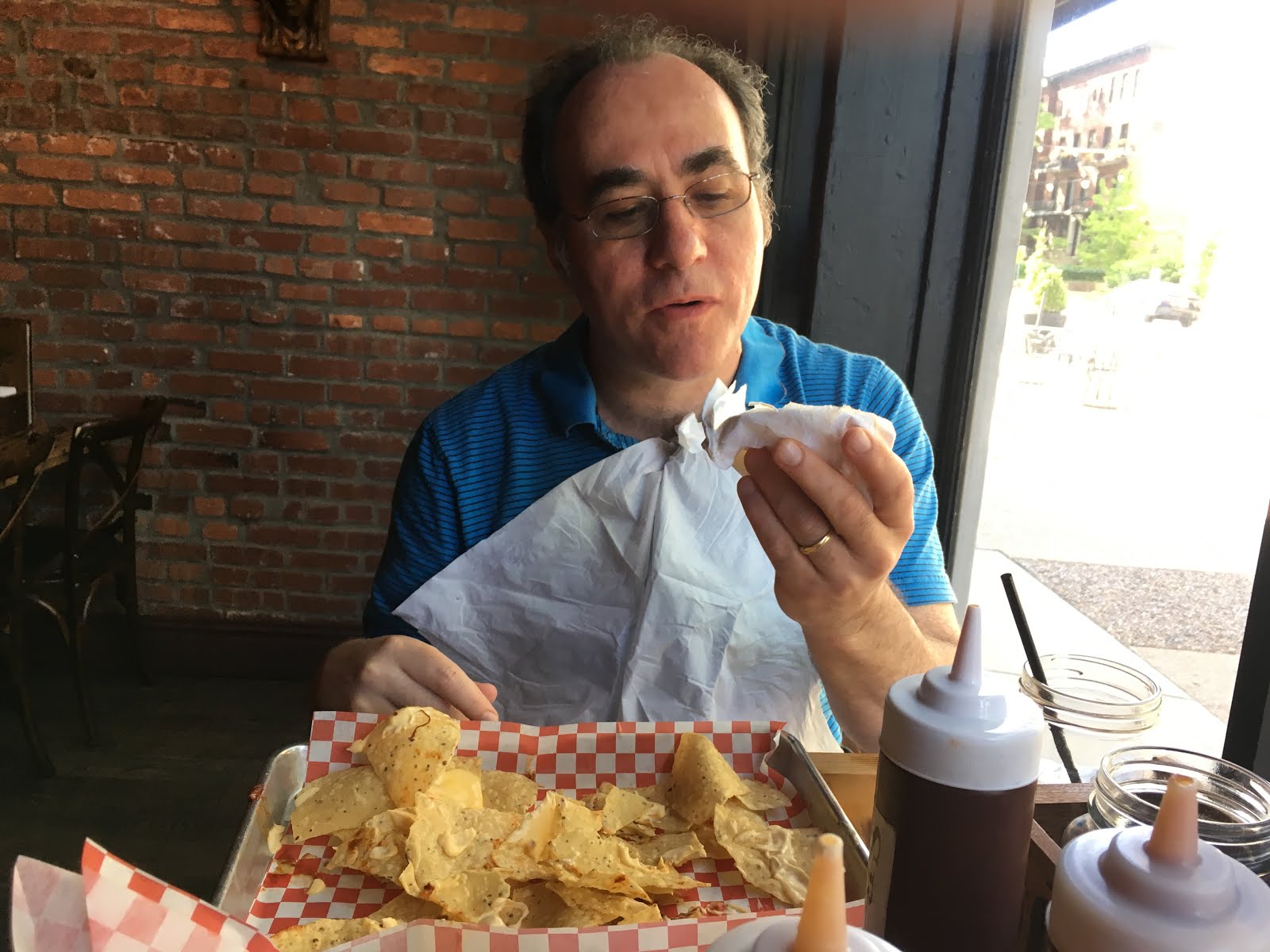 David ordered the pulled pork nachos. He looked to be in heaven as he savored every bite. Alas, my gluten-free readers, we cannot have this incredibly scrumptious dish because the BBQ sauce used for this meal is not gluten free and neither are the chips....